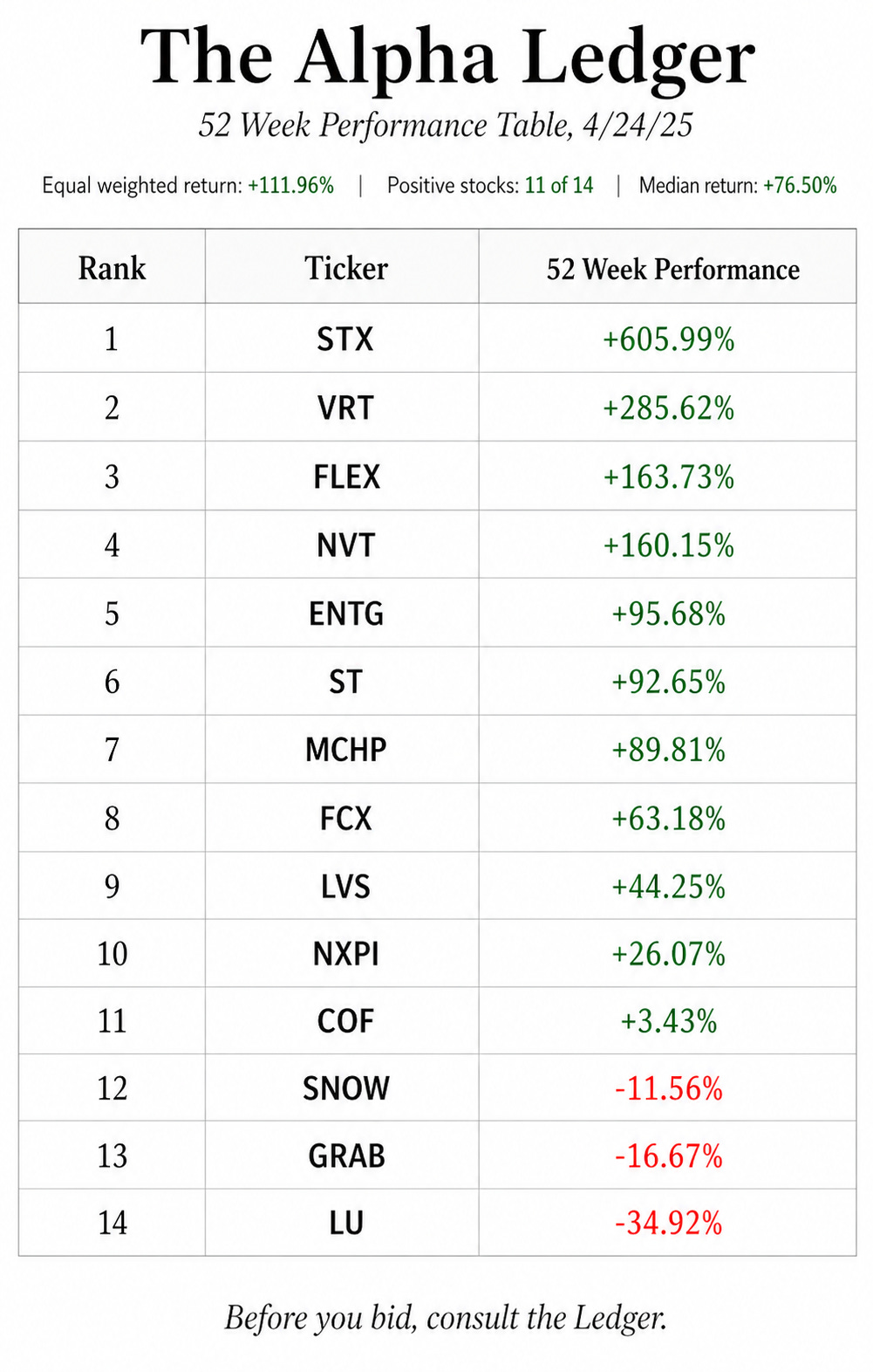 An equal weighted list of the first Ledger names returned +111.96% over one year. Out of 14 stocks, 11 finished positive. Ten gained at least +25%, eight gained at least +50%, and four gained more than +150%.